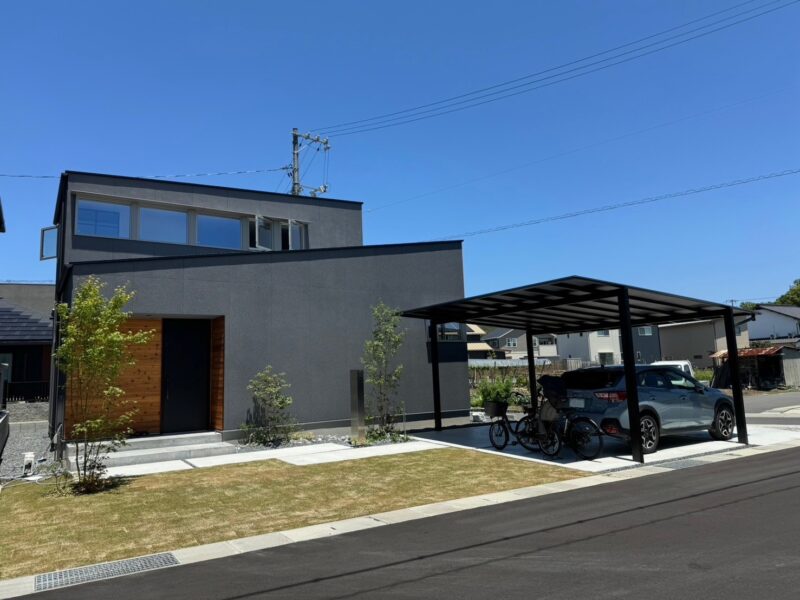 フラットなカーポートが建物のモダンな外観と合い、全体に統一感をもたらしています。