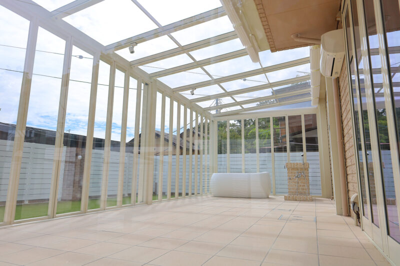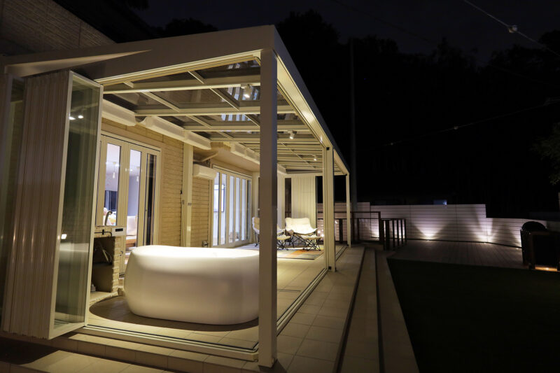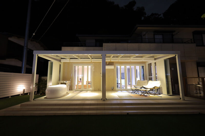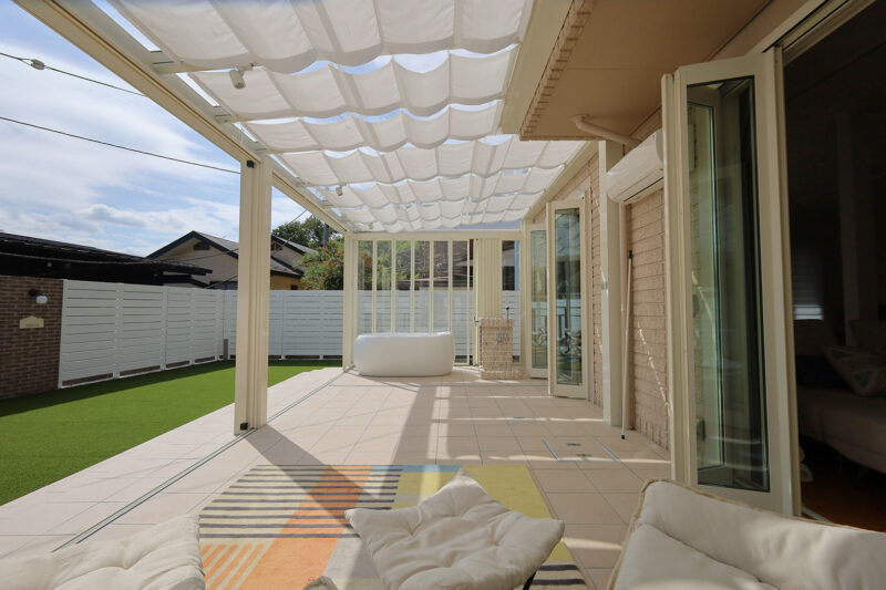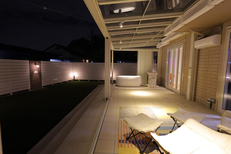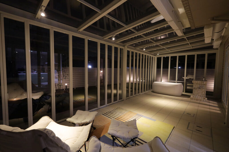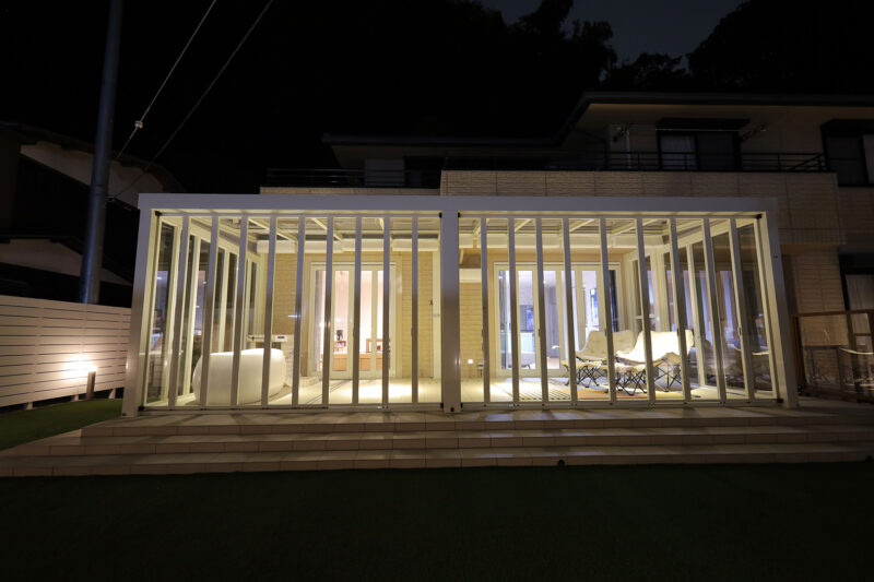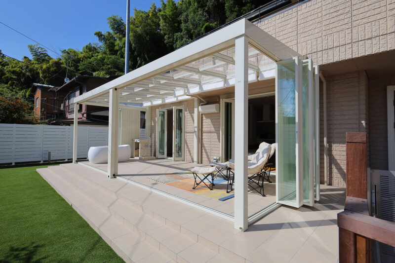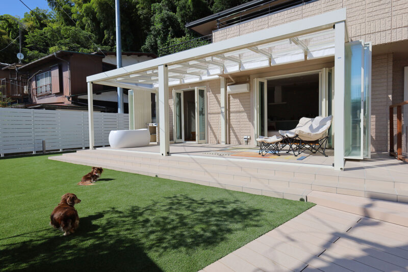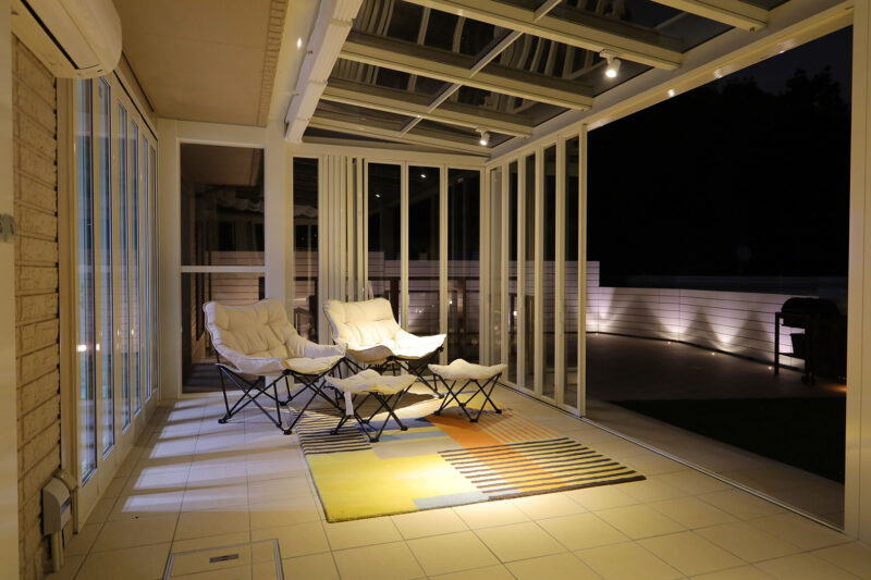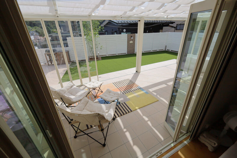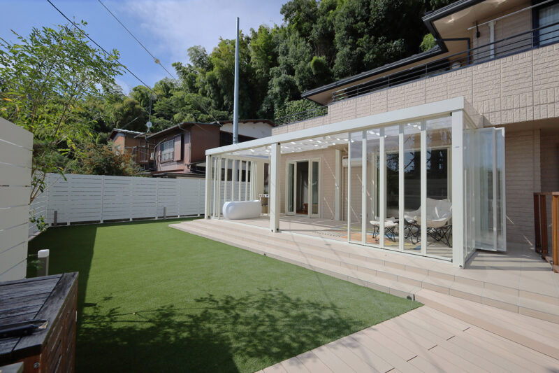 特にご希望を頂いたのが、ガラス張りのガーデンルームです。扉を閉めてお部屋のような感覚で使うほか、季節によっては扉を全開して、オープンテラスとしても使うこともできます。
