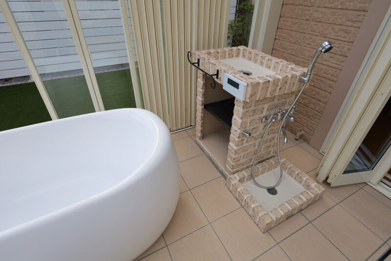 バスタブは、ご主人様たってのご希望を実現したもの。給湯器を備え、シャワーはもちろん追い炊きも可能で、通常の浴室と変わらない使いやすさを実現しました。手の届く場所にタオルかけをつけるなど、動線をお客様と相談しながら丁寧に設計しました。じっくりとお湯につかってリラックスしながら広い空をあおぐ、そんな特別な解放感を楽しめます。