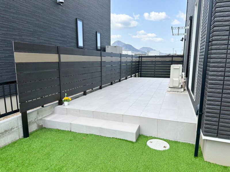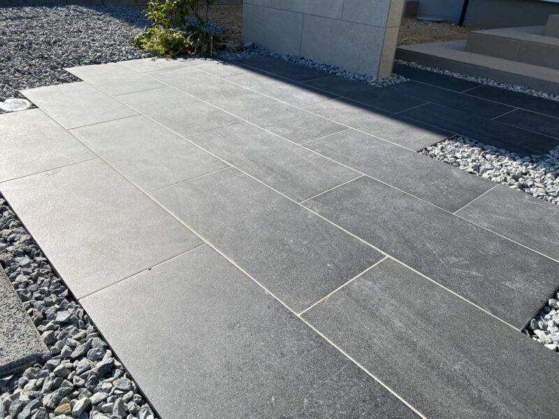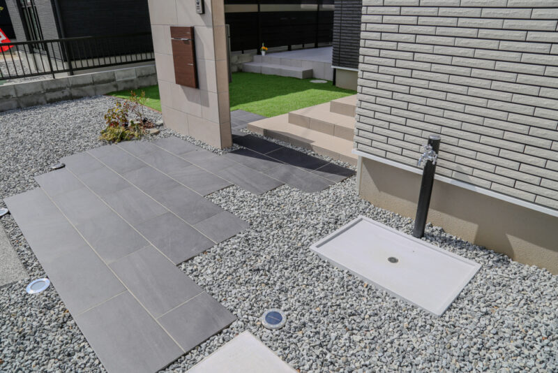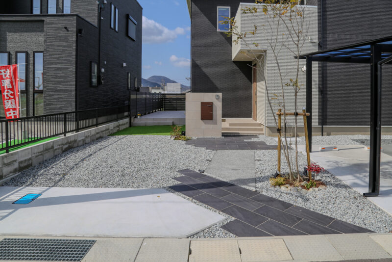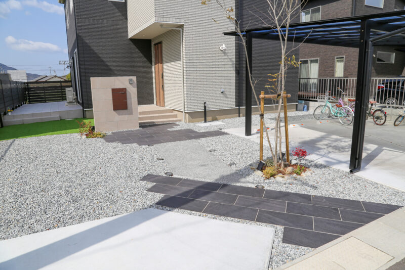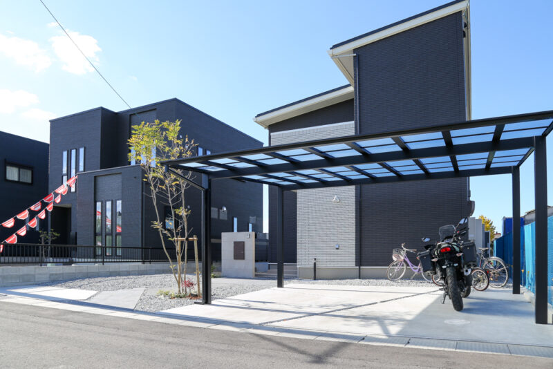 駐車スペースはゆとりを確保し、カーポートを設置することで機能性にも配慮。シンボルツリーが程よい柔らかさを添え、全体のバランスを整えています。