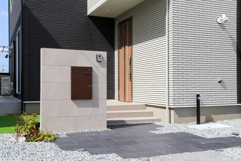 門柱はシンプルながらも高級感のある佇まいに。木調ポストをアクセントに取り入れることで、無機質になりすぎない温かみをプラスしました。