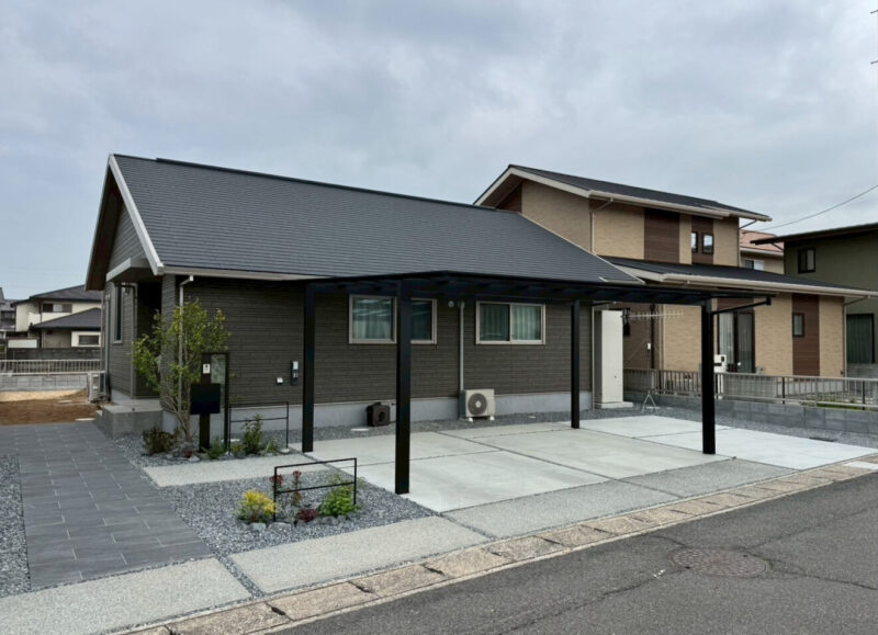 2台用のカーポートは、ブラックのフレームとフラット屋根で、モダンな印象に。