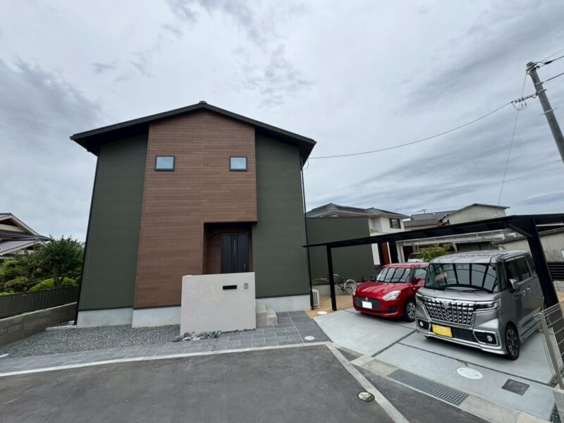 エントランスはシンプルなアプローチで、2台分のカーポート付きカースペースは雨の日も快適な利便性を提供します。