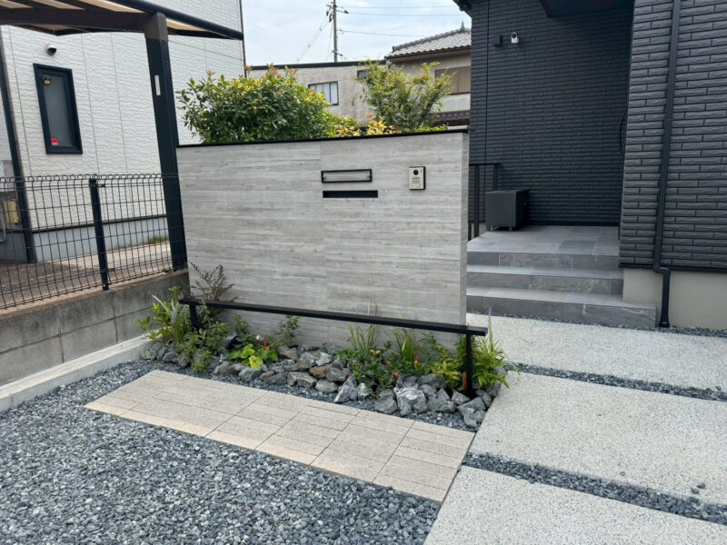 機能門柱と植栽をバランスよく配置し、使いやすさと見た目の美しさを両立。