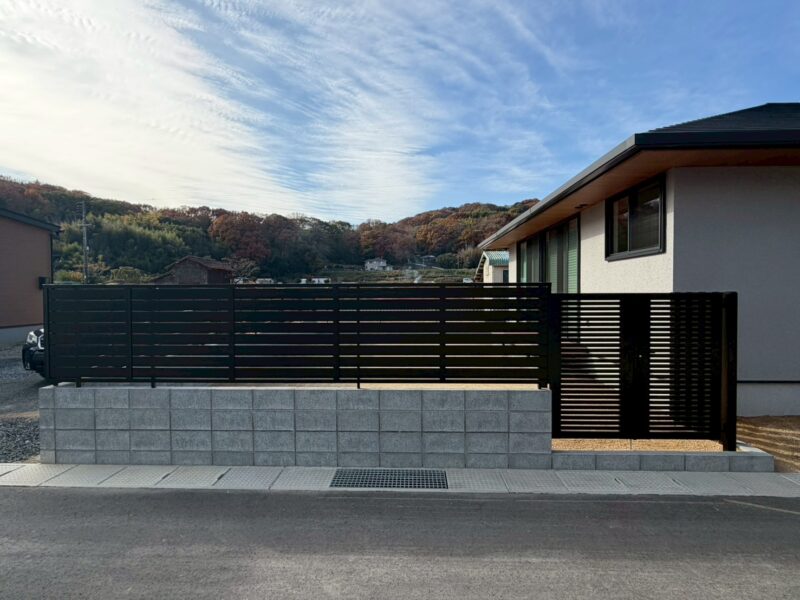 門柱を単なる壁ではなく、一つの「作品」として捉えたデザイン。計算された位置に配された黒のフレームラインが、空間にリズムと奥行きを生み出しています。住まいの格を一段引き上げる、まるで現代アートのギャラリーを彷彿とさせるアプローチです。