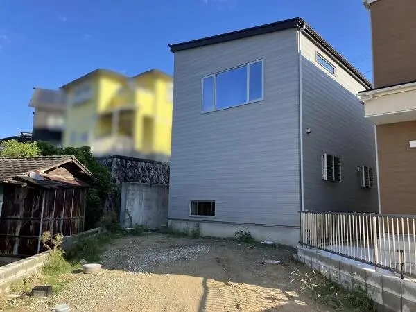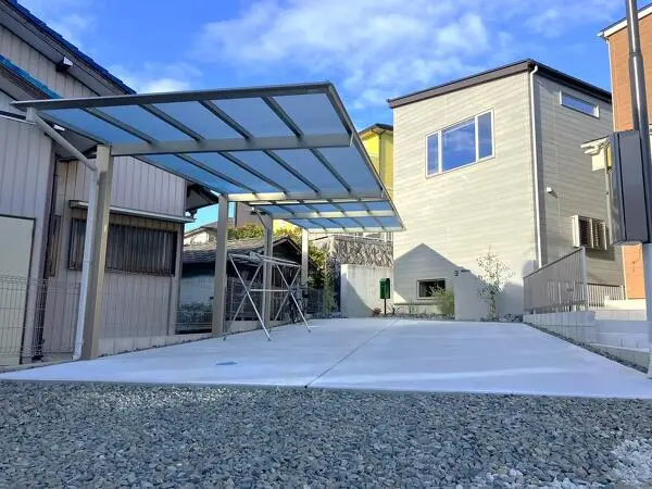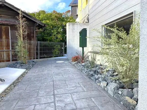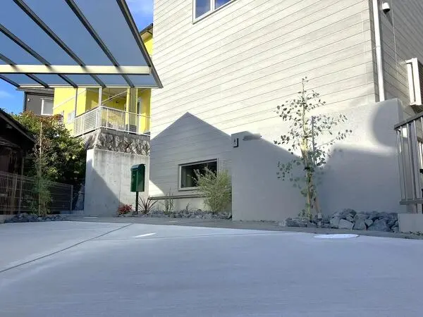 白い建物にグリーンのポストとポポラスがよく似合う、可愛らしい外構になりました。
