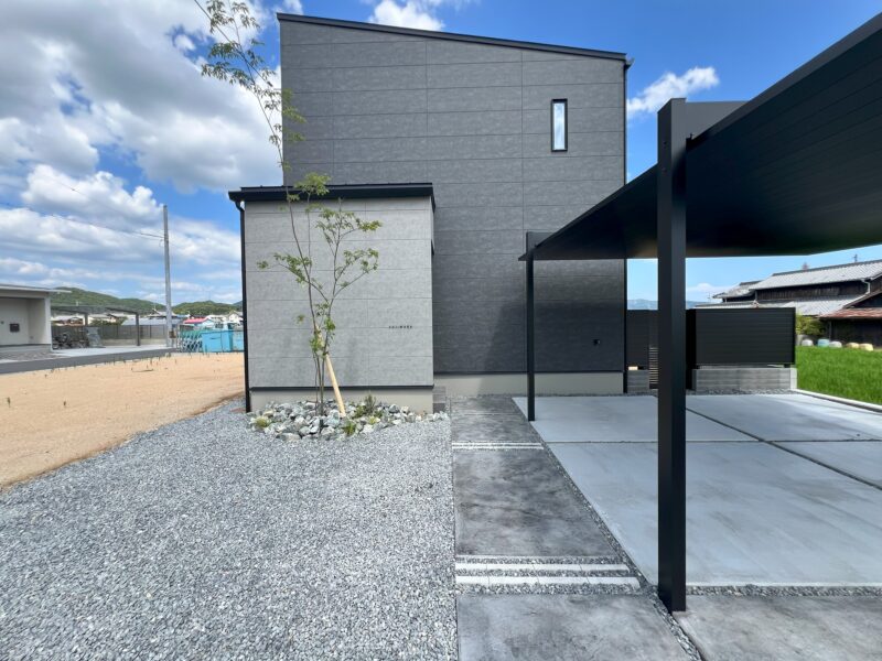 シンプルスタイリッシュな外構。フラットカーポート「FⅡ」で作るスマートなデザイン。玄関までのアプローチはスタンプコンクリートで仕上げました。