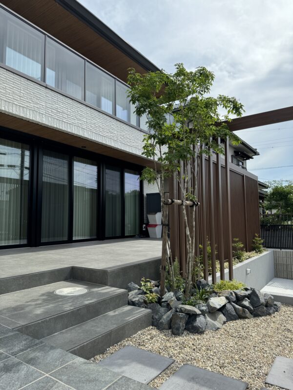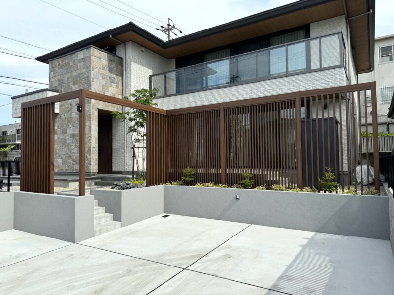 二世帯でお住まいのお客様からのご依頼は、玄関ポーチの雰囲気を活かしたアプローチ、リビング前にタイルテラスと目隠し、そして4台分以上の駐車場が欲しいとのご相談でした。
