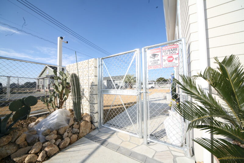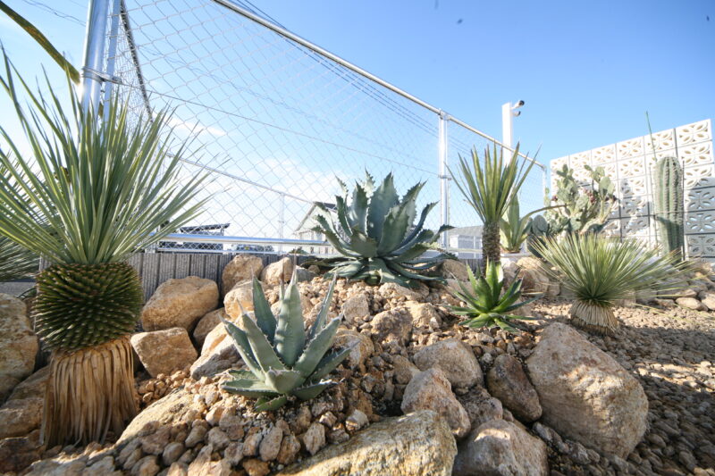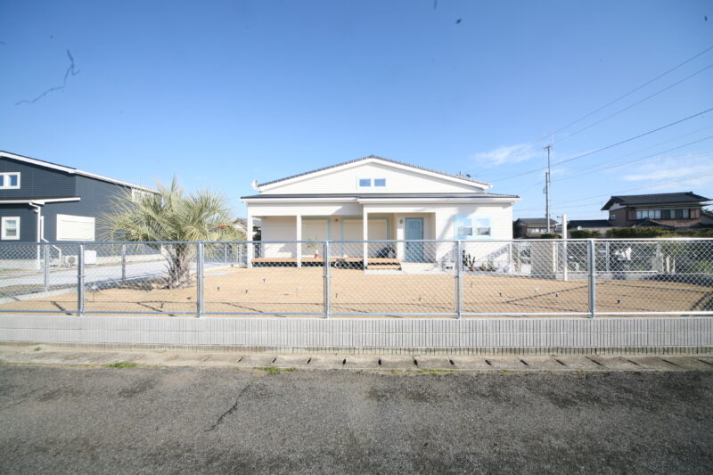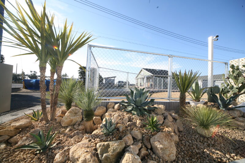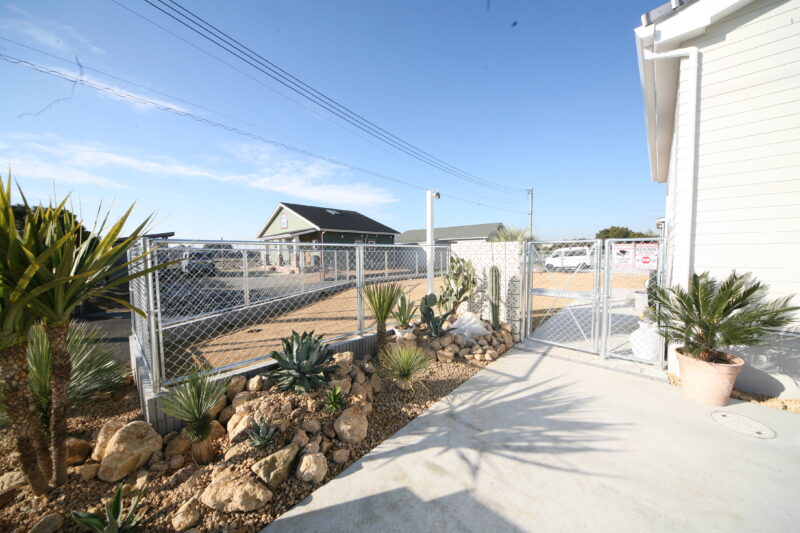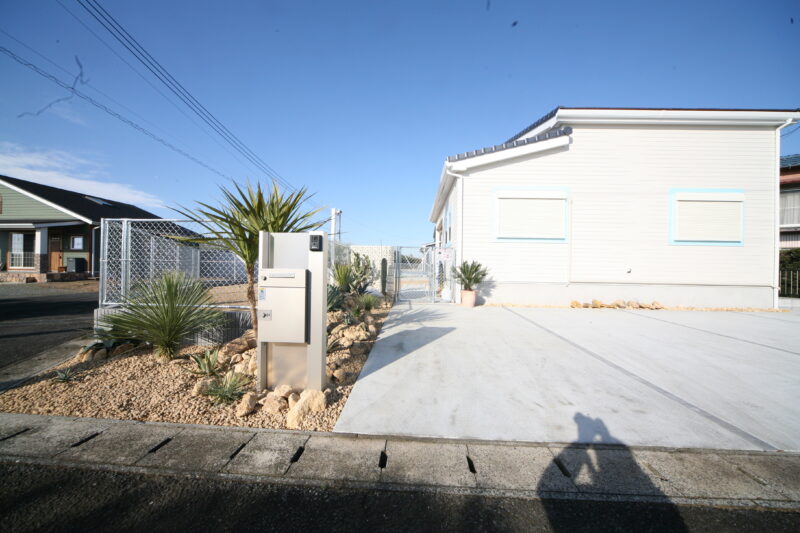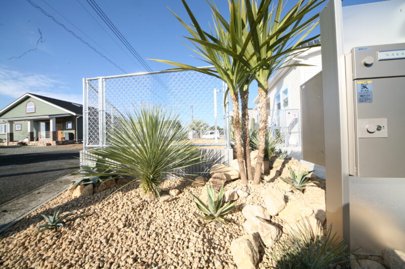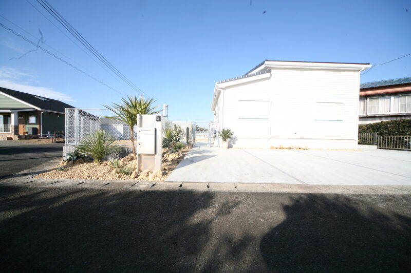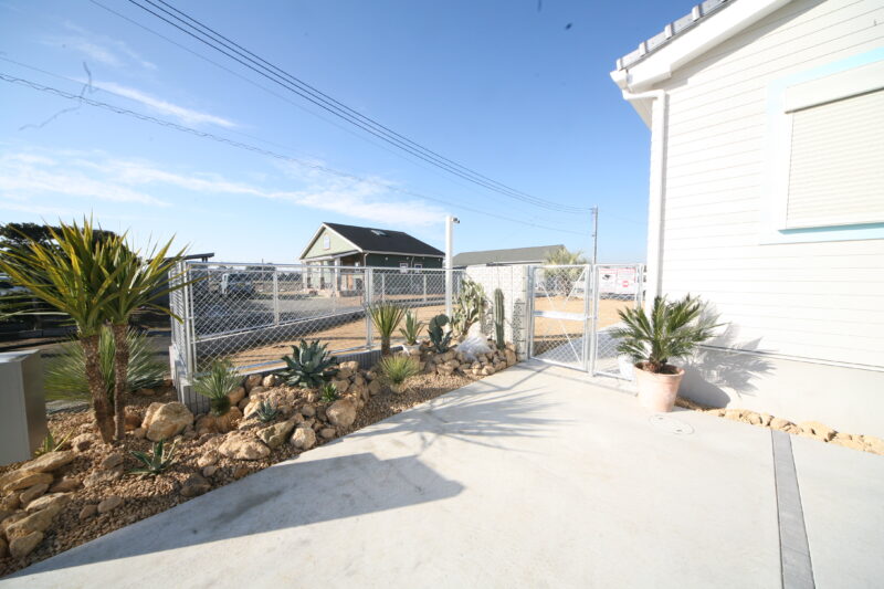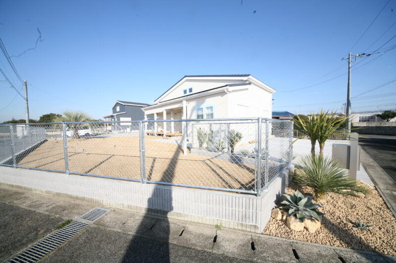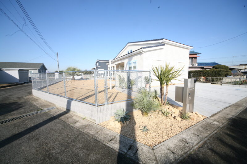新築時に駐車場とアプローチにはコンクリートが仕上がっており、以外の飾りつけ計画させて頂きました、お庭には愛犬用のドッグランが希望でしたので、建物に合わせたアメリカンフェンスを外周に取付、出入り口もPC門扉でコーディネートしてみました、アクセントにはポーラスブロックで間仕切り、グランドカバーは芝生を敷き詰めドッグランの完成、植栽はオーナー様の趣味でアガベやサボテンなど流行りの植栽を植えて頂き。グランドカバーには戸隠石でドライガーデンの出来上がり、愛犬と趣味の御庭の完成
