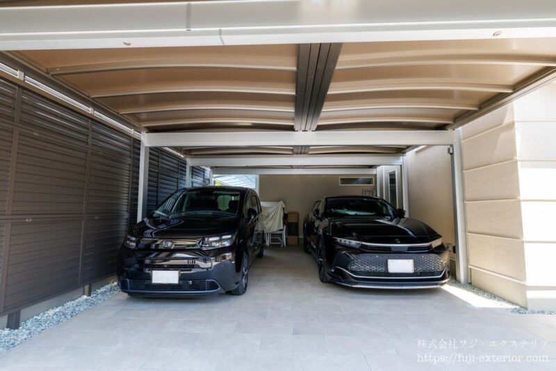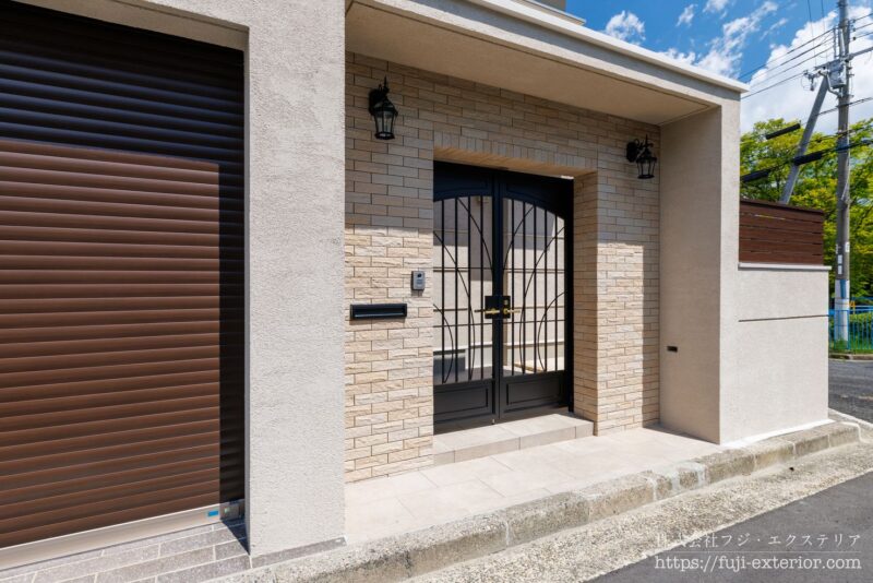 高級感のあるエントランスと、心地よいプライベートなリゾート庭。高いデザイン性と実用的な暮らしやすさを両立した、新築クローズエクステリアです。