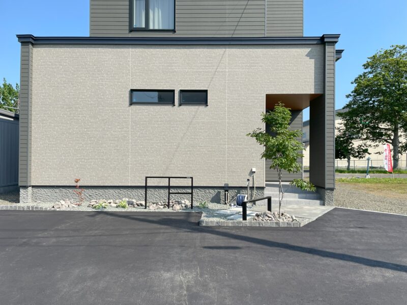 正面から見たお住まいの印象をスタイリッシュにしたお庭です。