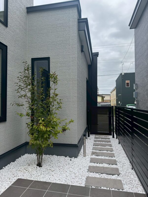 シックな色味のロータイルテラスに白砂利が映え目を惹くお庭です。